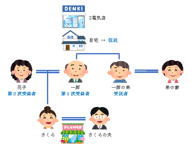 一郎さんは、「弟を受託者、一郎さんを受益者として自宅を信託」します。一郎さんが死亡した場合でも、第2次受益者をあらかじめ花子さんと定めておけば、一郎さん亡き後でも信託は継続します。なお、信託が終了した場合は、信託財産は、信託行為において定められた残余財産受益者又は残余財産帰属権利者に移転されることとなります。