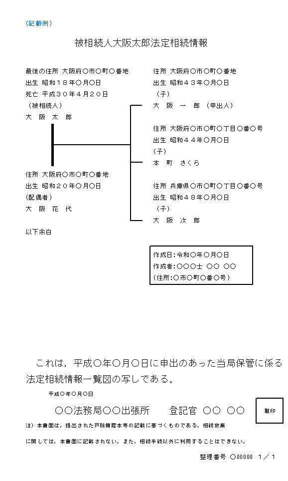①戸籍・除籍謄本等(以下、「戸籍等」といいます。)を収集し法定相続情報一覧図(被相続人の氏名、最後の住所、相続人の氏名、住所、続柄の情報を記載したもの。)を作成し、②法務局に保管を申し出ることで、③以後5年間は無料で法務局の認証がある法定相続情報一覧図の写し(以下、「法定相続情報証明書」といいます。記載例をご参照ください。)の交付を受けることができます。