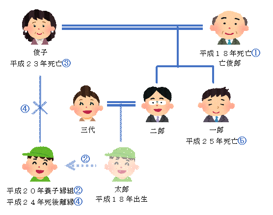 さて、夫(俊郎さん)から多額の遺産を相続した二郎さんの母の俊子さんが、平成20年に節税対策のため、孫の太郎君(当時2歳)と養子縁組(普通養子縁組)をしました。その結果、俊子さんの子供は2人から3人に増えました。しかし、養子縁組の本来の目的は、太郎君と俊子さんとの間に法律上の親子関係を作ることですから、養子縁組と同時に、太郎君の親権は二郎さんと三代さんから俊子さんに移ります。