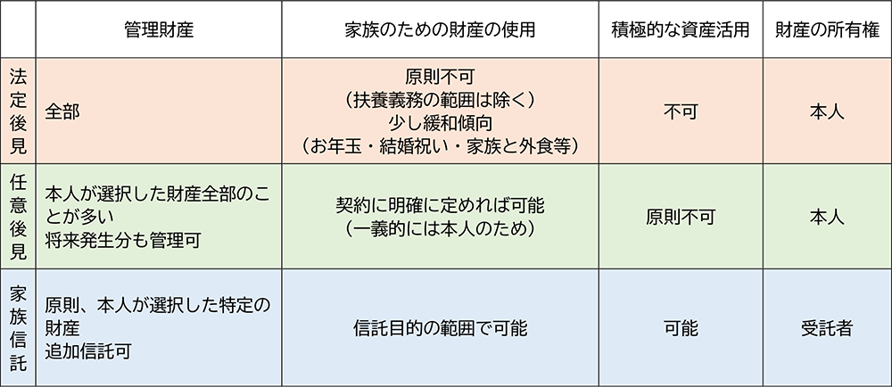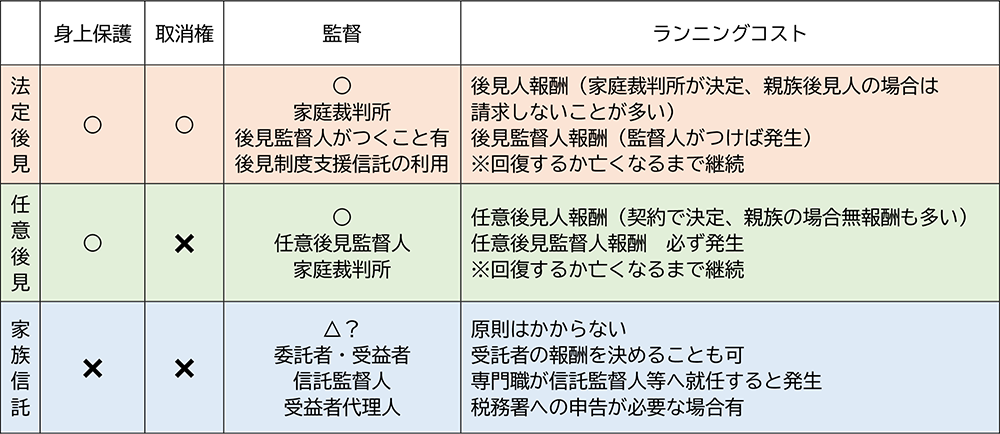 「家族信託」は、財産を持っている人(委託者:例えば父)が信頼のおける親族(受託者:長男)に特定の財産(信託財産:賃貸アパート)を移転(不動産や現金の所有権を移転)し、自分自身または他の親族(受益者:父)の利益のために、その財産の管理・処分を託す制度です。裁判所の関与はありません。委託者の判断能力があるうちに契約により設定します。認知症になってからでは使えません。報酬は契約で決めます。通常、親族間で行うので報酬はない場合が多いです。しかし、受託者をチェックする信託監督人あるいは受益者代理人等を専門家(弁護士、司法書士、税理士等)に依頼すれば、裁判所の監督がない分責任は重く、複雑さに応じ報酬はかかります。信託設定時には契約書はオーダーメードとなるので、任意後見契約の2~3倍、あるいは信託財産額の〇%と決めておられるところもあるようです。また、仕組みが難しく長期に亘るため、専門家の継続的にアドバイスを受けたり、毎年税務申告が必要な場合もあり、専門家や税理士費用が掛かることもあります。
