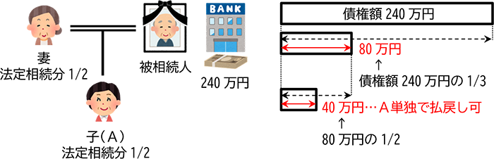 払戻しが可能となる金額は、原則として、遺産に属する預貯金債権のうち、相続開始時の債権額の3分の1に、払戻しを求める相続人の法定相続分を乗じた金額となります。例えば、被相続人名義の甲銀行の普通預金に240万円の残高があり、法定相続分が2分の1である相続人Aが単独で払戻しを求める場合、240万円×1/3×1/2=40万円までなら、A単独での払戻しが可能です。