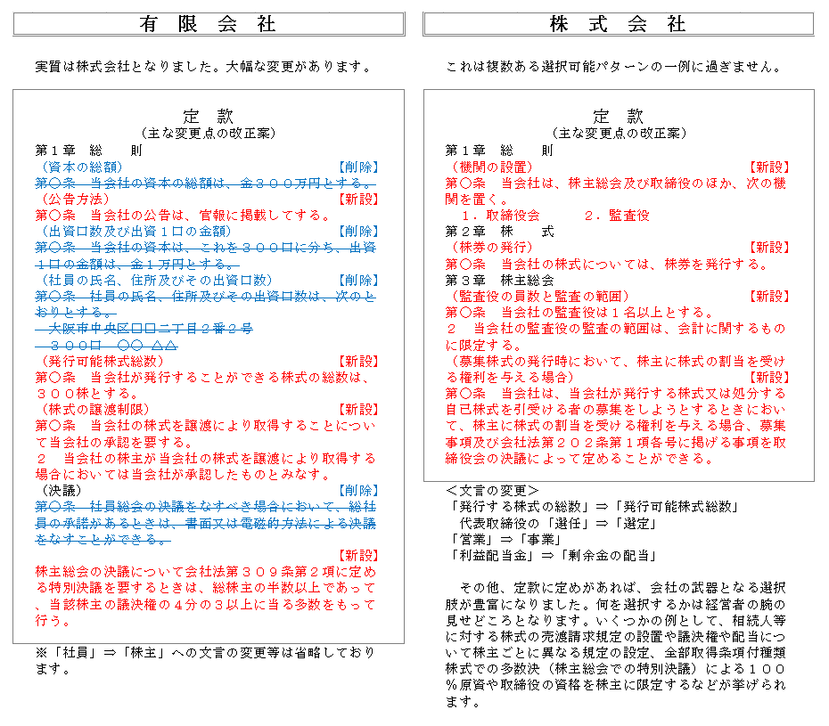 貴社がご自身で定款を変更したかどうかにかかわらず、2006年(平成18年)5月1日付の会社法施行をもって全ての会社の定款は変わりました。会社法施行に伴う用語等の整備及び「会社法の施行に伴う関係法律の整備等に関する法律」(2005年(平成17年)法律第87号)により、下記のように定款で使われる用語は変更され、機関のこと、監査役の権限のこと、株券の発行のことなど、いくつかの条文が貴社の定款に追加され、変更されたものとみなされています。この会社法施行により、オーナーの株式だけ株主総会における議決権を多くしたり、剰余金の配当を多くしたりする「株主平等の原則」の例外となる規定を定款に設けることもできるようになりました。しかし、これらのことは登記されないため、定款を見なければ分かりません。