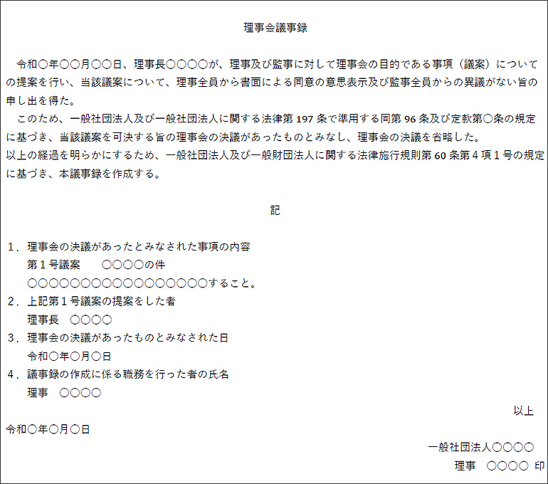 つまり、理事が提案した内容について理事全員(但し、議決に加わることができない者は含まない)が同意すること、定款に「書面決議についての定め」があること、監事が当該提案について異議を述べないこと、が要件です。