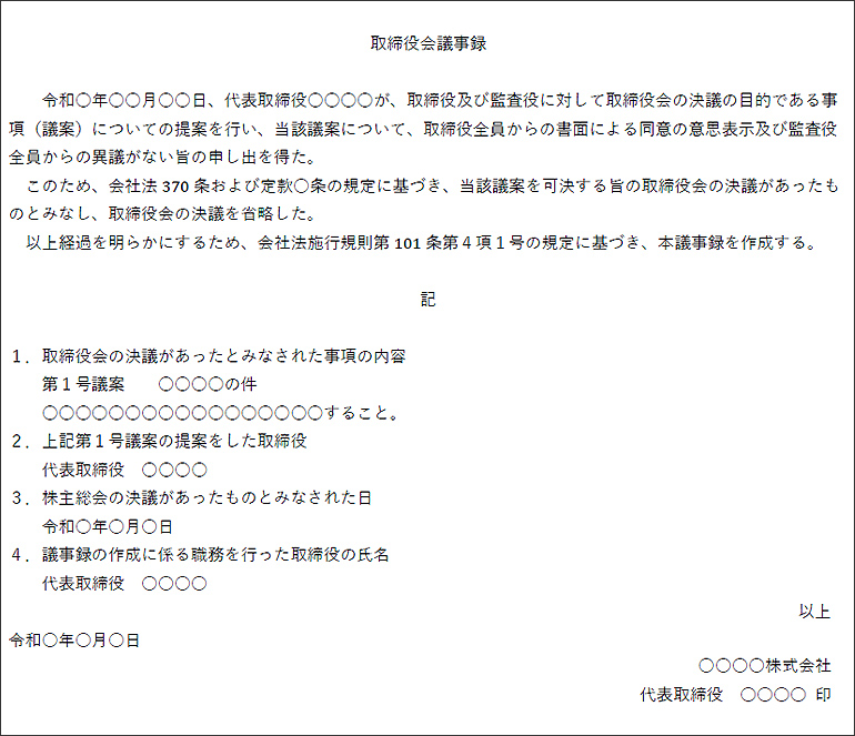 取締役会設置会社は、取締役が取締役会の決議の目的である事項について提案をした場合において、当該提案につき取締役(当該事項について議決に加わることができるものに限る。)の全員が書面又は電磁的記録により同意の意思表示をしたとき(監査役設置会社にあっては、監査役が当該提案について異議を述べたときを除く。)は、当該提案を可決する旨の取締役会の決議があったものとみなす旨を定款で定めることができる。