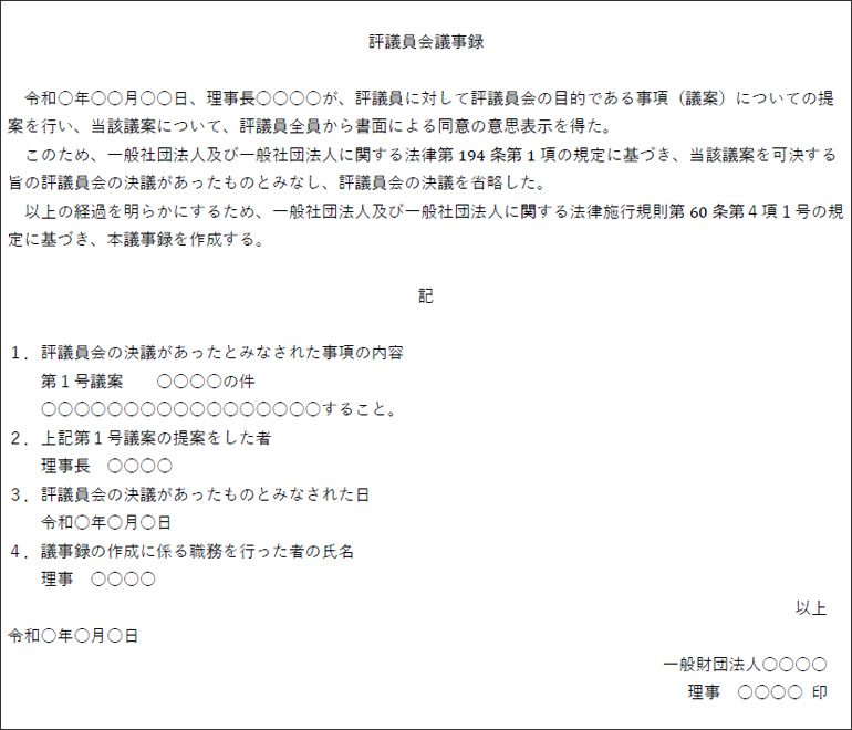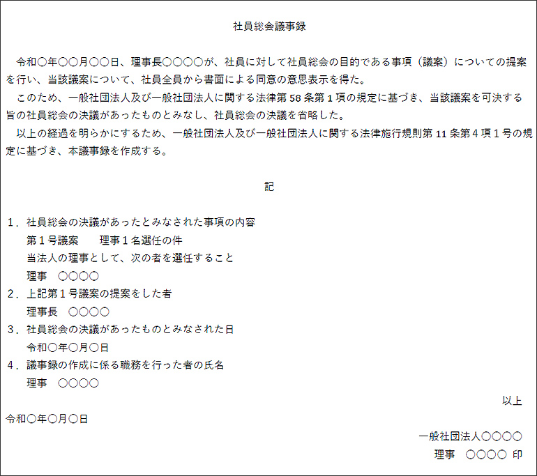 理事又は社員が社員総会の目的である事項について提案をした場合において、当該提案につき社員の全員が書面又は電磁的記録により同意の意思表示をしたときは、当該提案を可決する旨の社員総会の決議があったものとみなす。